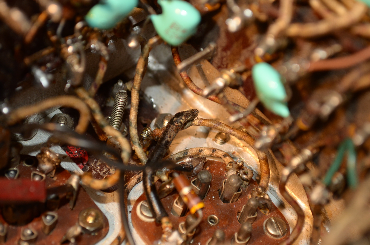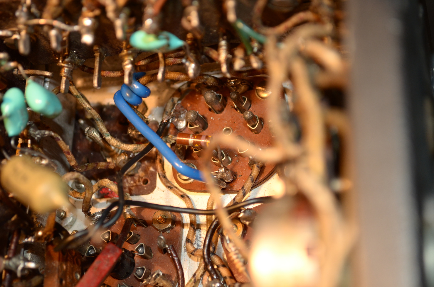 La inyección del BFO para el detector se hace mediante un capacitor gimmick (un pedazo de cable enroscado sobre otro) desde la reja del triodo sobre la placa del pentodo, en el cable que entra al último trafo de FI.